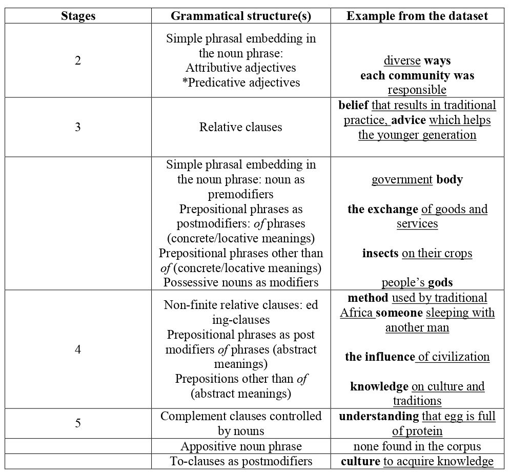 This study explores the relationship between second language proficiency and noun phrase complexity in the writing of students in an English for academic purposes (EAP) program. Based on a developmental progression index suggested by Biber et al. (2011), the project examined noun phrase complexity in the writing of intermediate and advanced students in an EAP program in Ghana. The study’s data consists of a corpus of 50 successful argumentative essays written by intermediate and advanced-level students. Findings from a comparative analysis corroborate the hypothesized developmental index. The intermediate group used more attributive and predicative adjectives, modifiers that have been predicted to occur early in the developmental index while the advanced group used more abstract phrases with relative and noun clauses, modifiers that have been predicted to occur late in the developmental index. Also, the use of noun modifiers by the advanced group was closer to the published frequencies of advanced writers as reported by previous studies (e.g., Lan & Sun, 2019). The paper concludes with some pedagogical implications for L2 academic writing instruction.