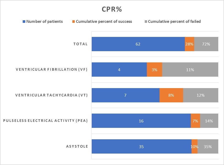 Background: Despite significant progress, cardiac arrest with no warning (SCA) remains a primary cause of mortality in many regions of the world. SCA can occur due to a variety of causes (cardiac/non-cardiac), situations (witnessed/unwitnessed), and locations (out of hospital or in-hospital). Objective: This paper aims to evaluate of the results of cardiopulmonary resuscitation in Iraqi patients. Patients and methods: This paper was presented as a cross-sectional study of the evaluation of the results of cardiopulmonary resuscitation in Iraqi patients, where it covered cardiopulmonary patients in different hospitals in Iraq from 24th January 2021 to 15th August 2022. Cardiac arrest was characterized as an unresponsive adult patient who is either not breathing properly or is not breathing at all, with no carotid pulse or evidence of circulation. This study was including patients who have ages above 50 to 80 years for 62 cases patients. The methodology process of collected data were analysed and implemented by SPSS. Results and discussion: The purpose of this study was to see how several situations affected the success rate of CPR. As previously stated, CPR outcomes were notably ineffective in those with hypertension, diabetes, as well as heart and renal disorders. Survival following resuscitation can be influenced by factors such as the procedure's quality and urgency, the treatment team's expertise, the patient's age, underlying condition, and individual characteristics. The first identified cardiac rhythm failed to substantially correlate with the CPR success rate, as noted in the findings section. However, the greatest rate of success was found in VF as well as VT, PEA, as well as ASYSTOLE rhythms, respectively. According to 2018 research, CPR has a 29% 30-day survival rate. It went on to indicate that 45% of those with a favourable resuscitation result had VF and VT as their first cardiac rhythm; 40% exhibited a PEA rhythm, whereas 15% did not have a rhythm. Similarly, in the current study, the success rate for CPR was about 41% in participants who’s first identified cardiac rhythm following monitoring was VF and VT. Conclusions: The present study is a follow-up epidemiological inquiry into cardiac arrest in this hospital, and it has indicated that previous medical histories were an important factor in CPR results. Furthermore, persons who do not have the underlying condition have a far better probability of surviving. In conclusion, we found that a considerable majority of patients who suffered in-hospital cardiac arrest had poor outcomes. These are caused by the presence in comorbidities.